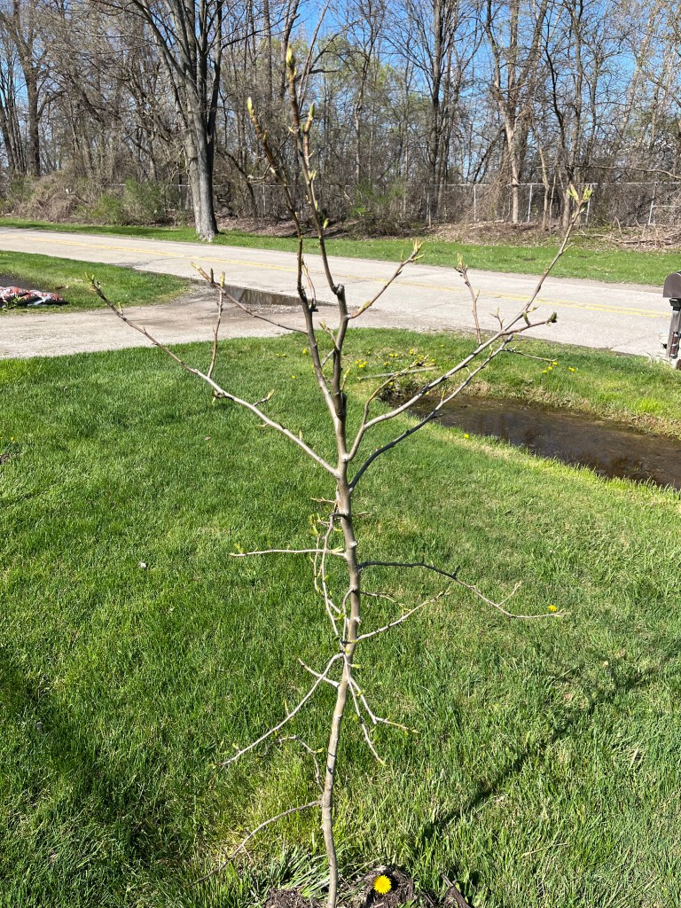 Planted August, 2023, this crooked and spindly tree looks like an abstract sculpture. These bulbous pears should be, soft and juicy… hopefully.
