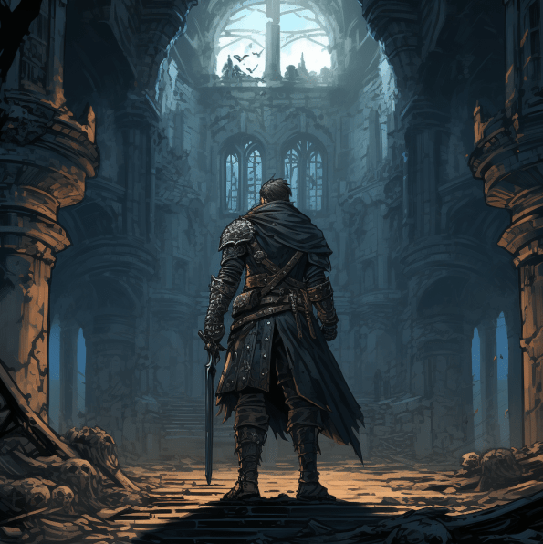 A lone figure standing in the ruins of an ancient cathedral.