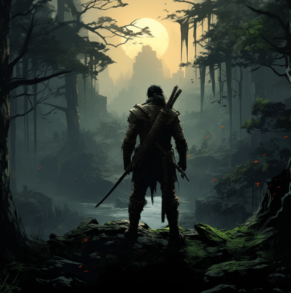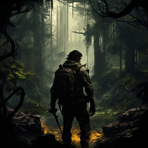 A lone figure exploring a dense, humid jungle.