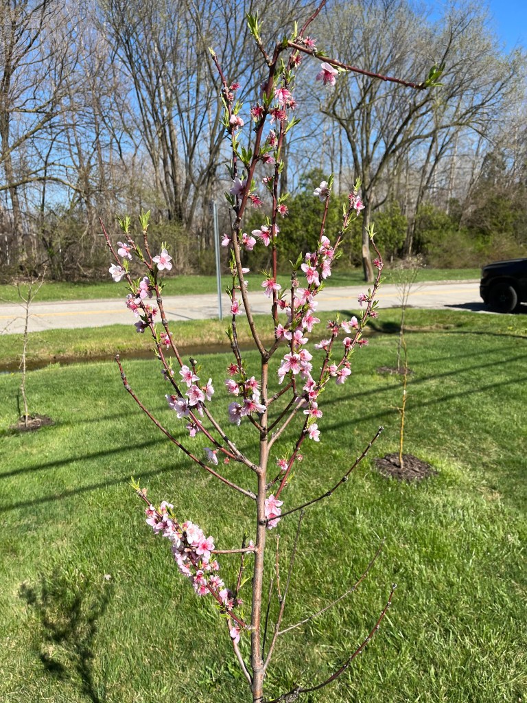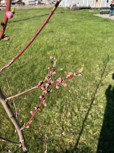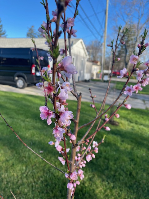 4.28.2024. Planted in August with the Georgia (as well as the black tart and ranier), the Junegold tree is two years older. It flowered just as vibrantly as the Georgia in March. We have no idea if it will peach or not, or what the signs are. I guess we’ll find out.