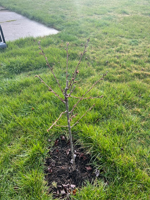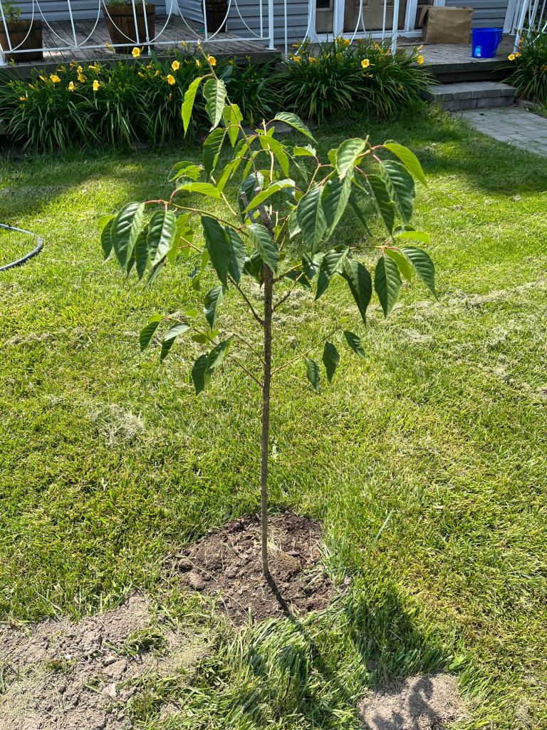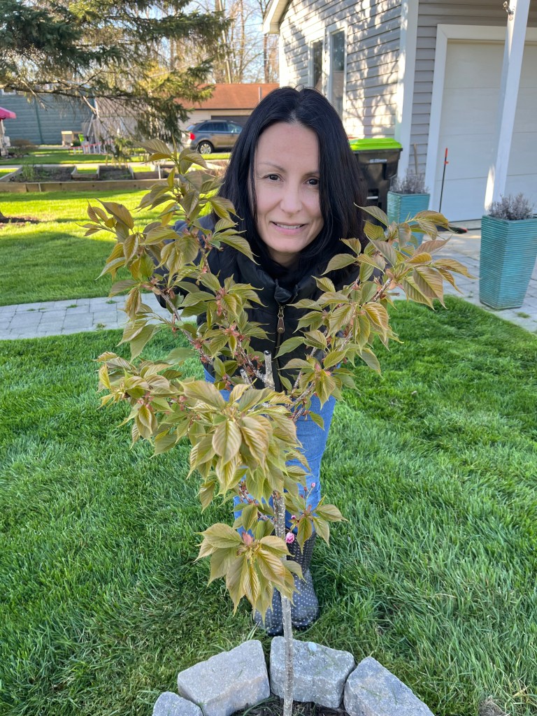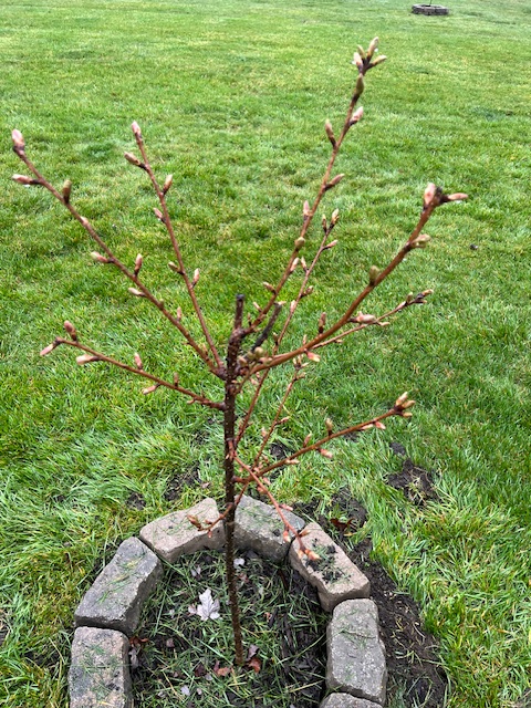 4.27.2024. The African Kwanzan and the Japanese Yoshino were to be the two front trees, pink and white in the spring and summer. The Yoshino and Kwanzan were not thriving so we moved the Yoshino to the other side, and the Kwanzan right in front of the house. The Yoshino, unfortunately, did not survive.