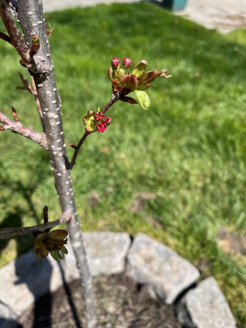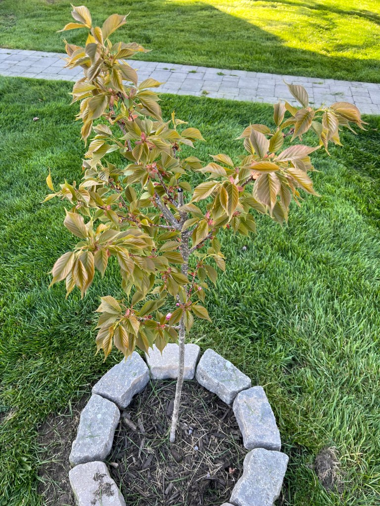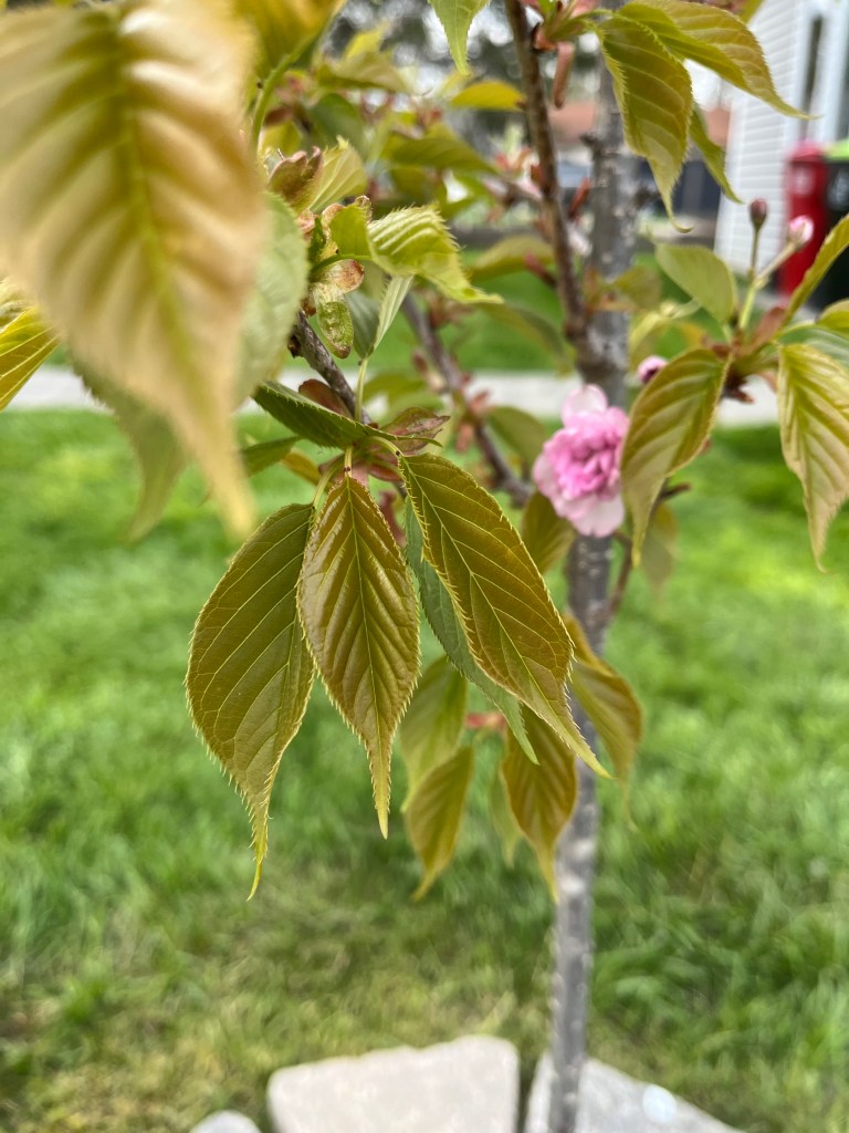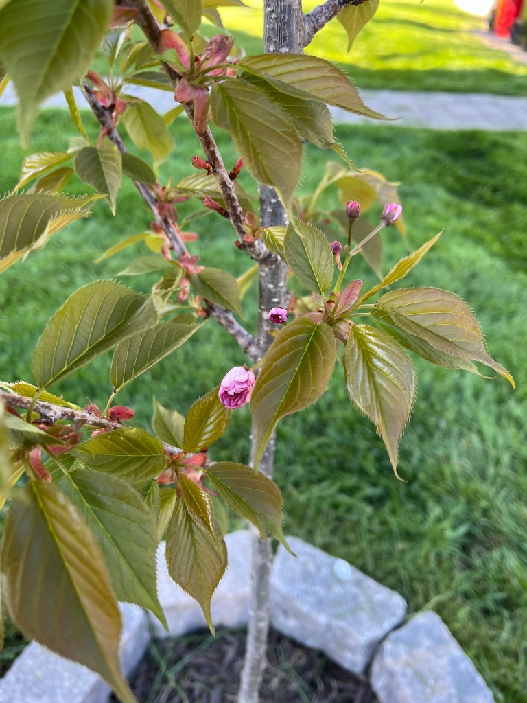 The Kwanzan was eaten alive by Japanese beetles but braved the winter and started budding fresh in early April. Now the leaves are full and there’s a few flowers to boot.