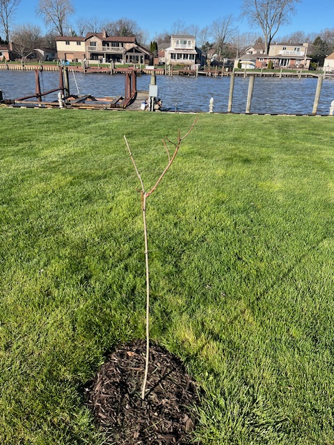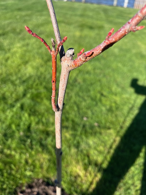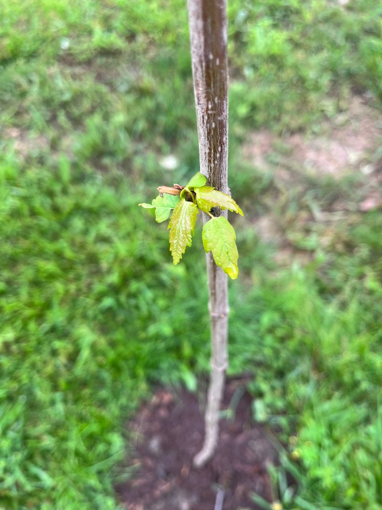 6.23.2023. The third week in June, after the maple had spent weeks looking like a twig sticking out of the dirt, it burst to life, in all colors from reddish brown to vibrant green. Immediately after documenting this, the next night, it was ravaged and ruined by renegade deer who can’t seem to get their fill from the 8,000 other maple leaves in the area. They had to target this one little baby tree. As deer have a track record for stealing food, apples especially, we have declared war on trespassing deer. Nature wants to compete for food, so – challenge accepted…