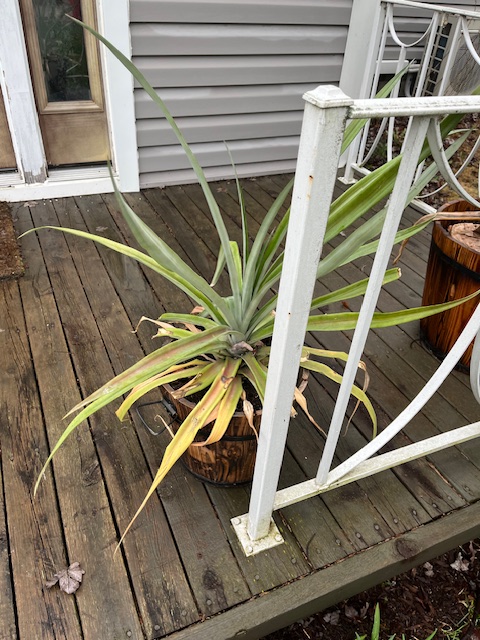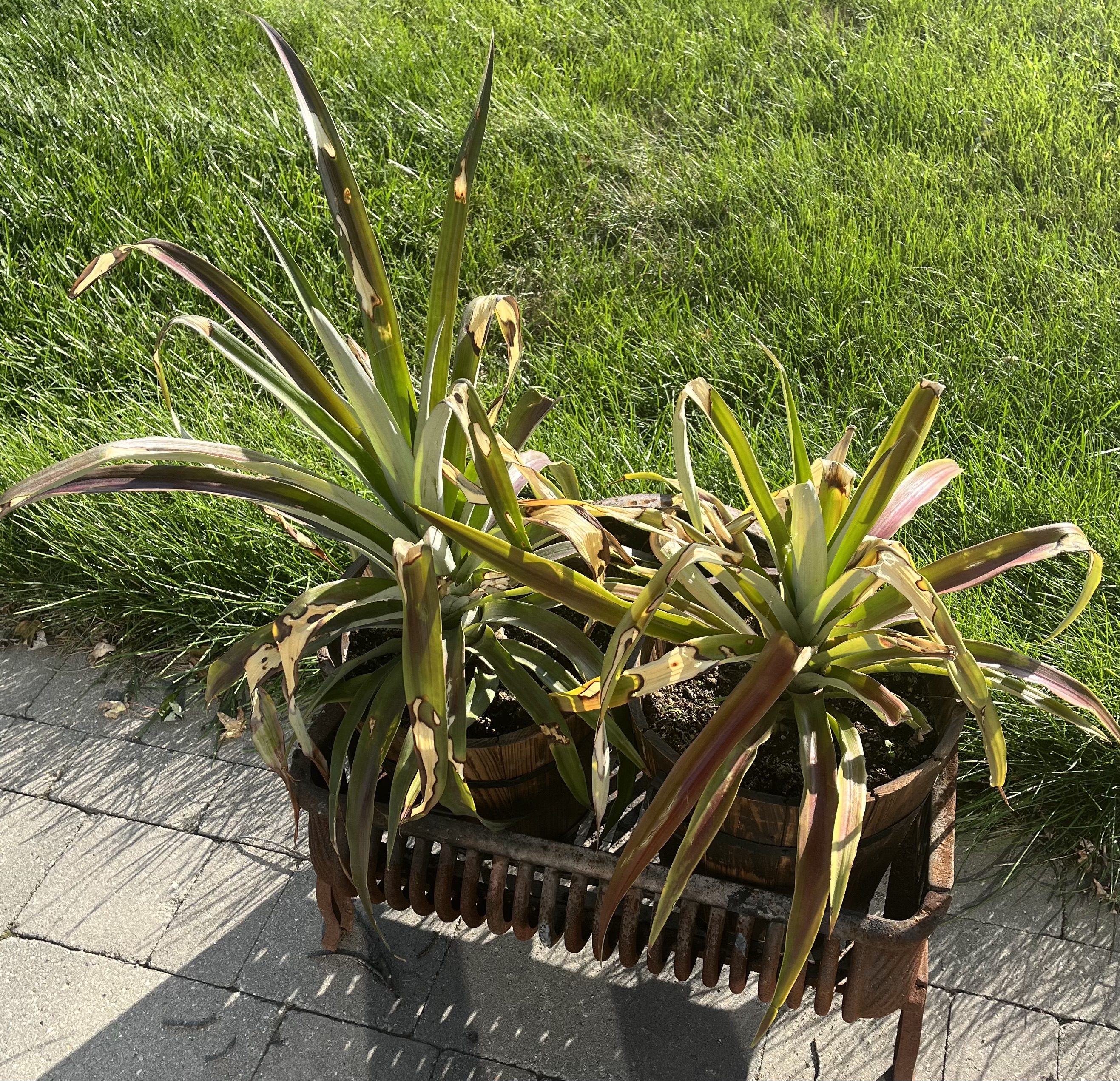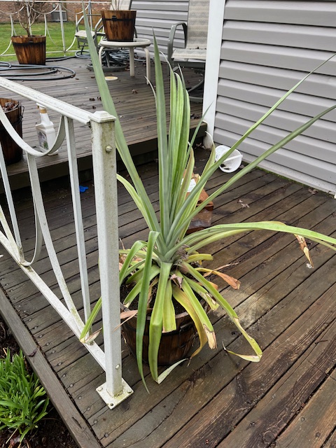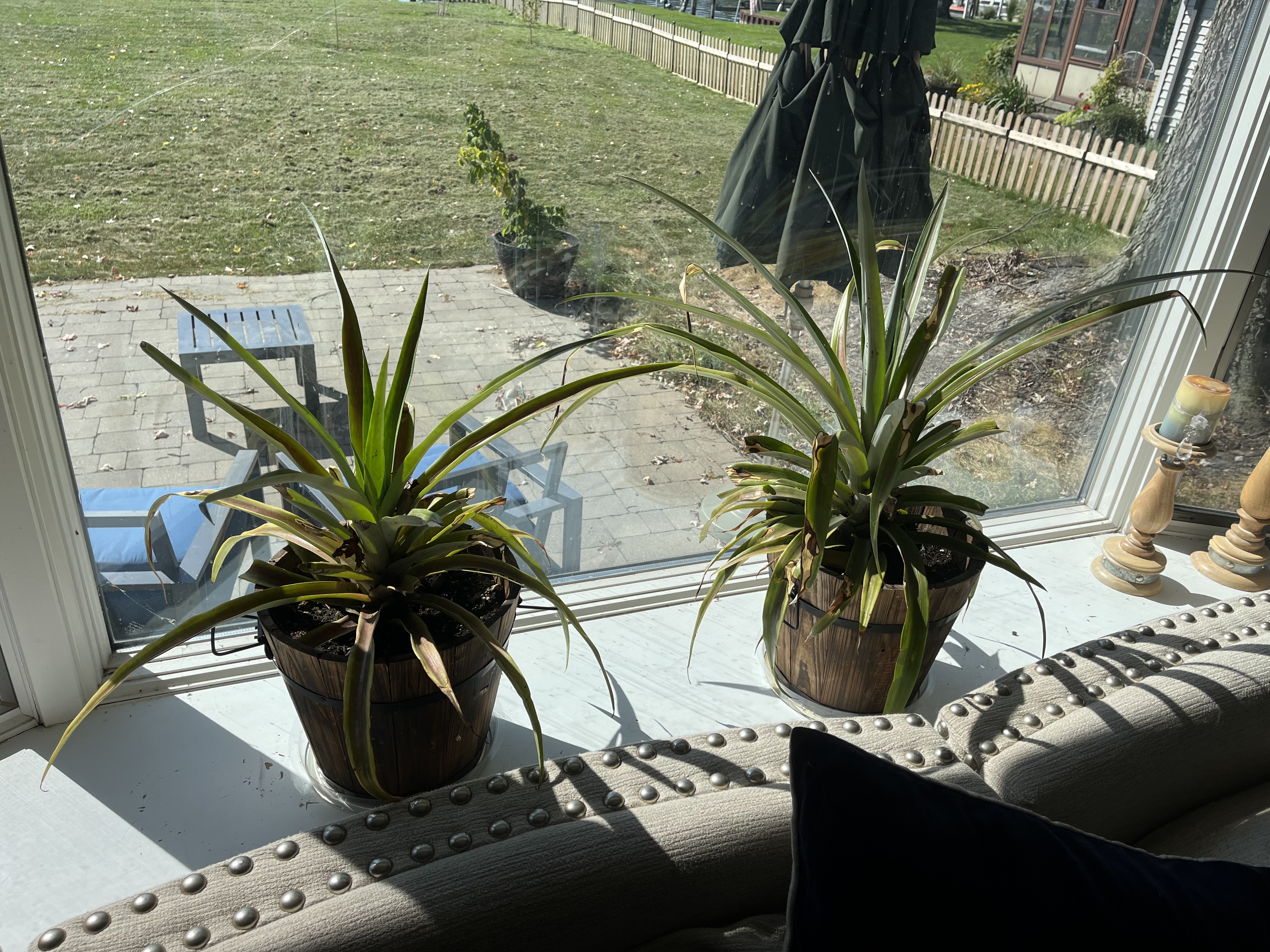 4.28.2024. These pineapples were a gamble from the beginning. We moved them inside and they sat growing seemingly okay. Then I put them outside in April and a windy storm beat the hell out of them, as well as the banana and avocado trees. I’ll remember to wait until May next year (if they all survive) and put them in areas not so wind-blasted. As they apparently take 2 years to grow one, may be a fruitless effort.