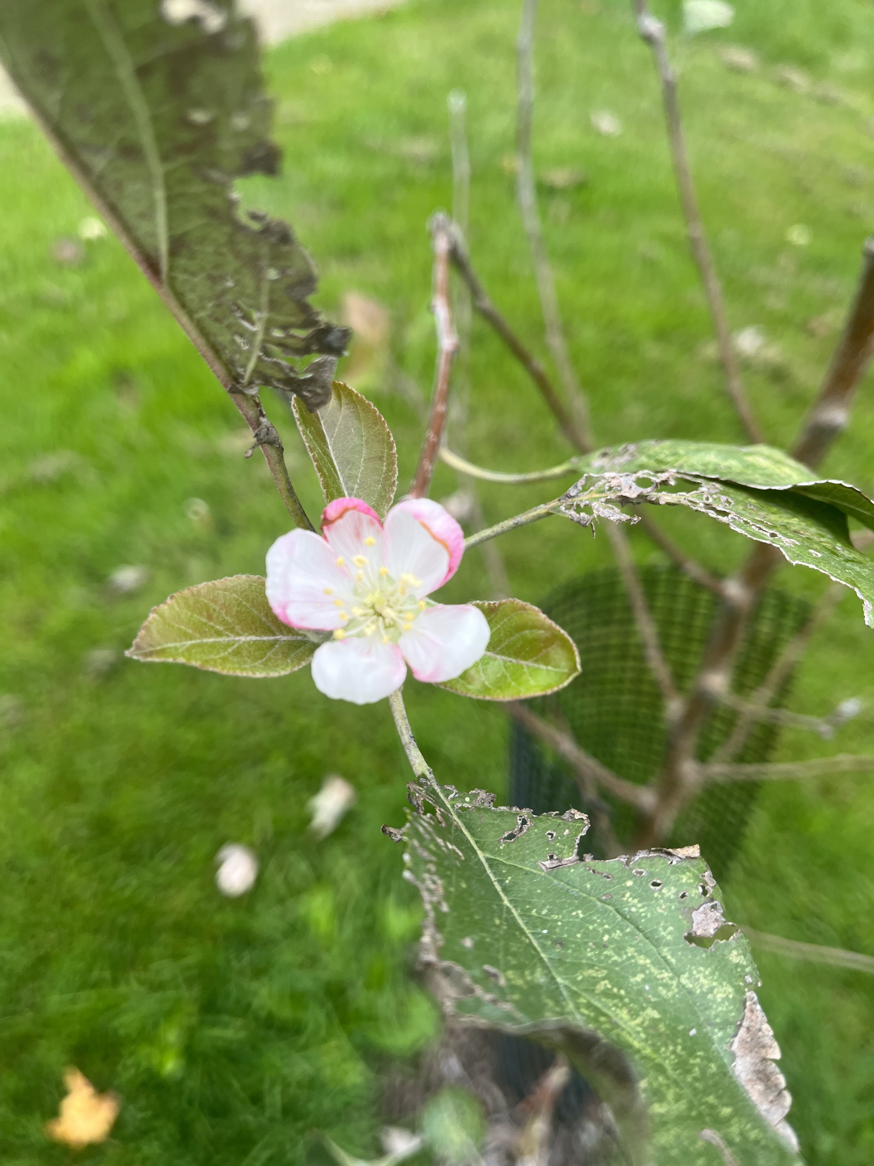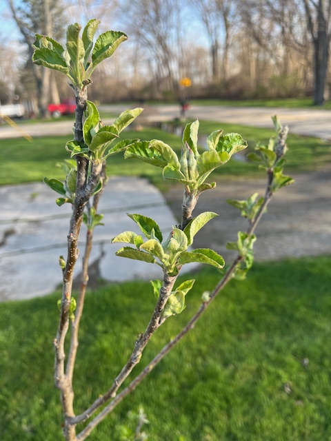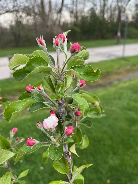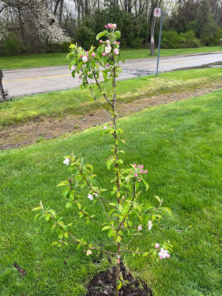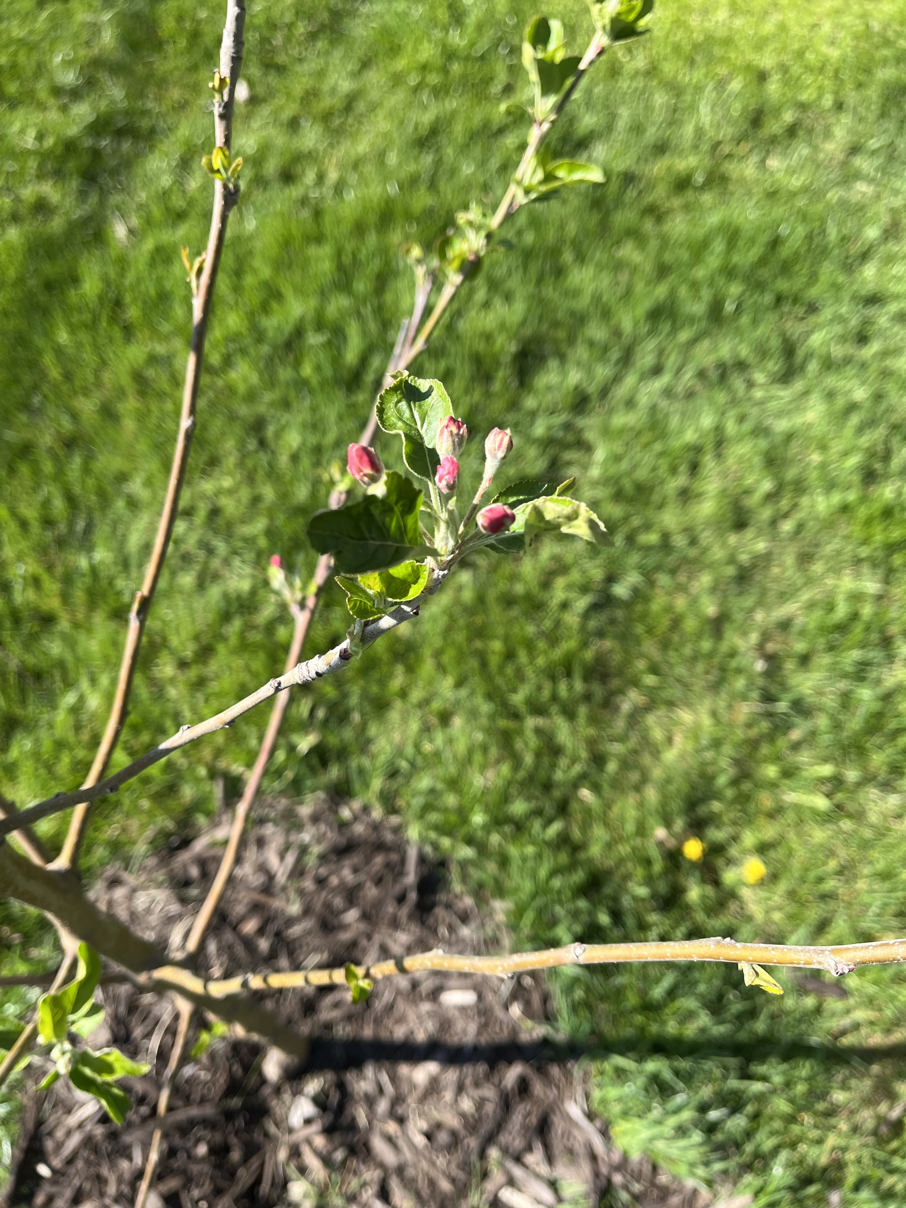 4.27.2024. Below the pink lady keeps her dead leaves last of all fruit trees. They fall in winter finally and as thaw comes early in March, everything sprouts, then the temperature drops and withers all the green. But by April, everything was refreshed, the flowers blossomed all over.