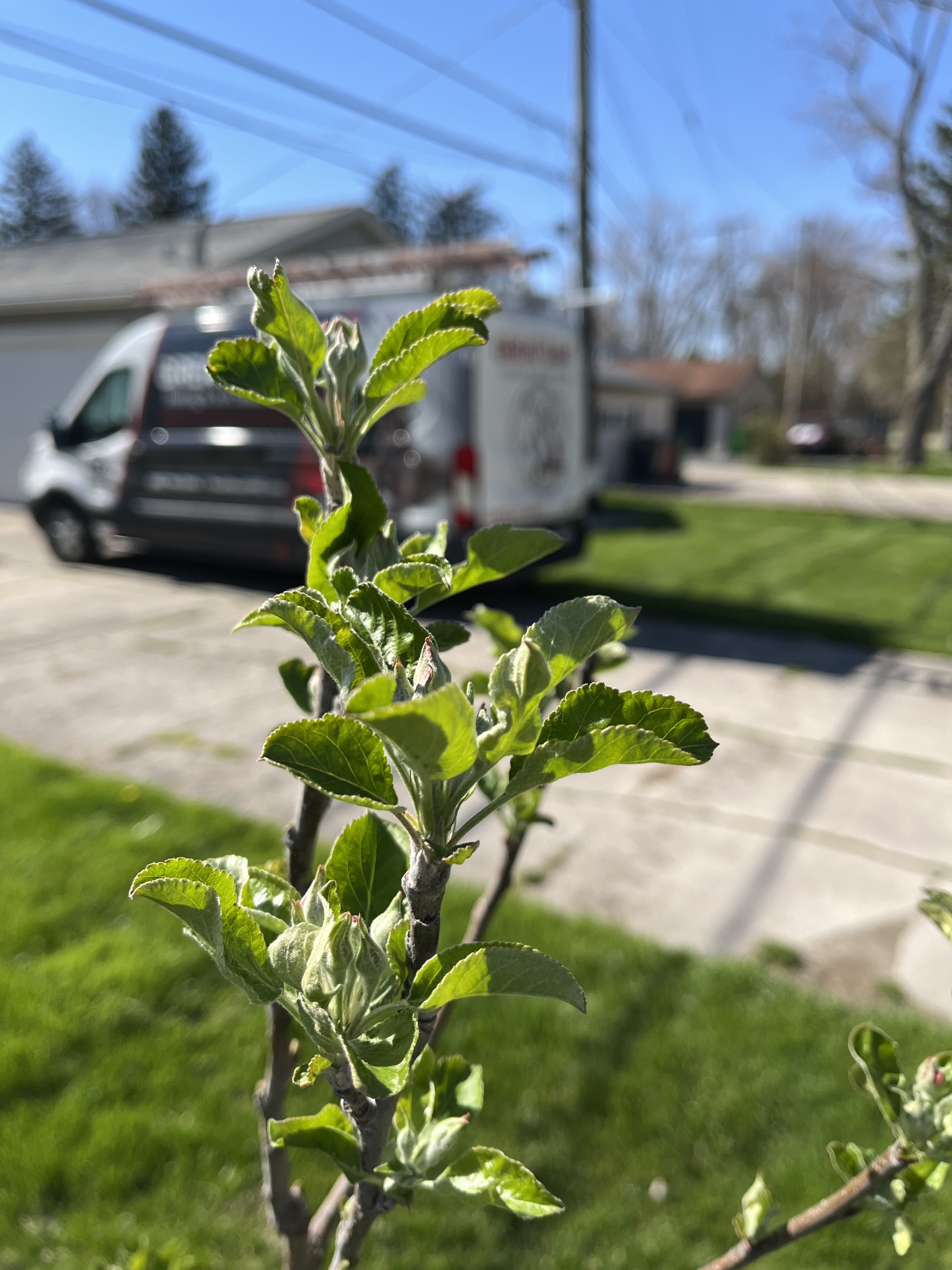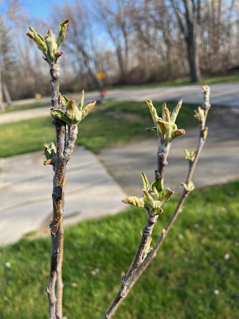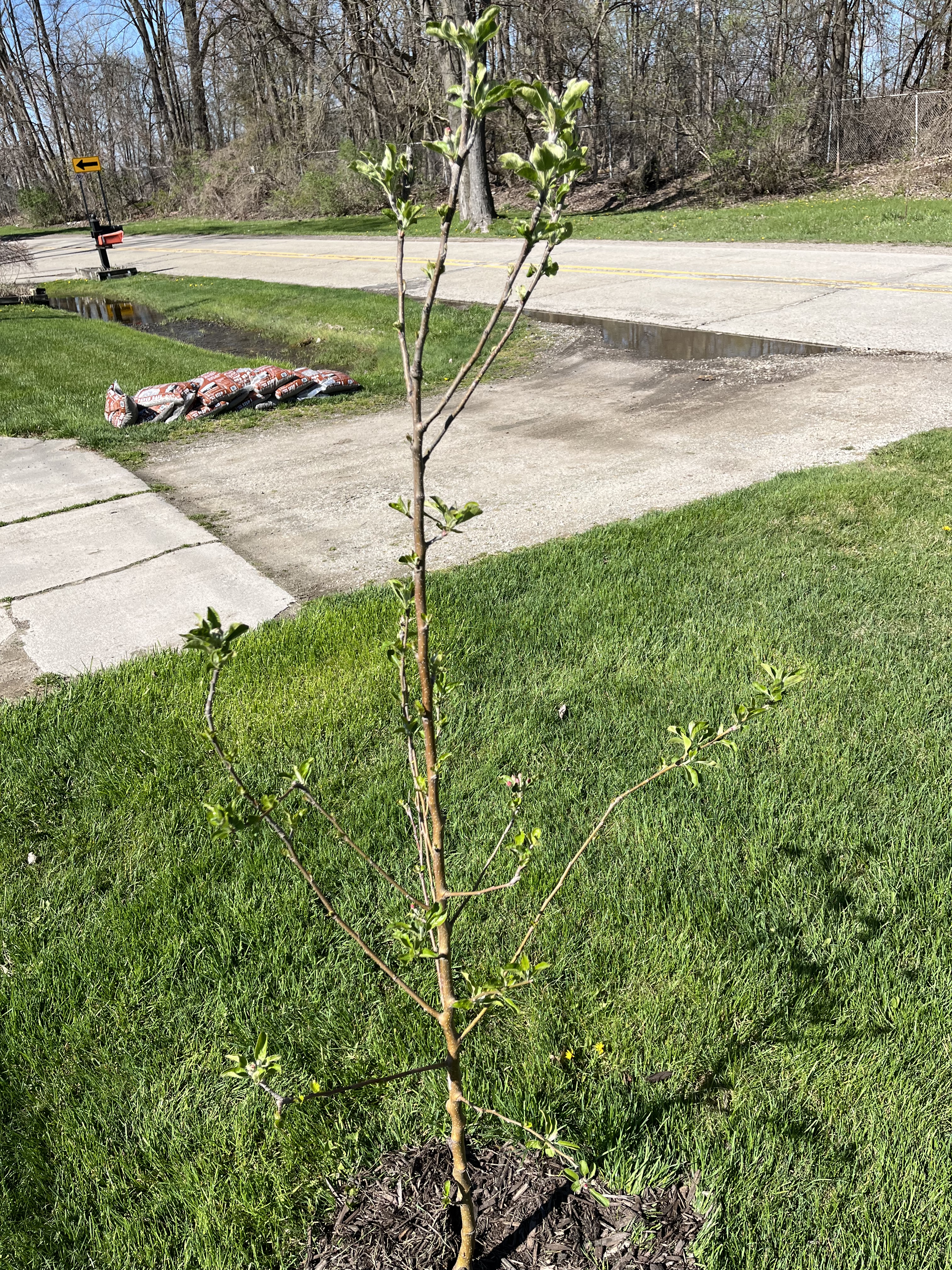 4.27.2024. Below the pink lady keeps her dead leaves last of all fruit trees. They fall in winter finally and as thaw comes early in March, everything sprouts, then the temperature drops and withers all the green. But by April, everything was refreshed, the flowers blossomed all over.