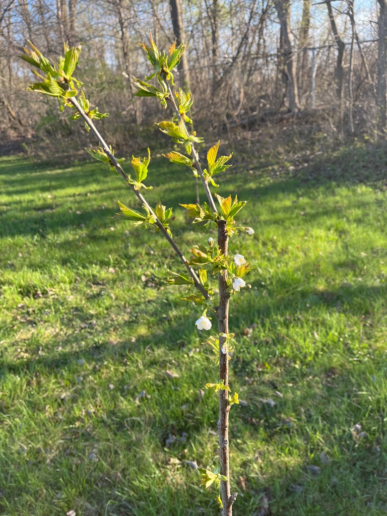 4.28.2024. The Stella boasts the biggest and brightest foliage. A few spring flowers signal the possibility of future cherries…