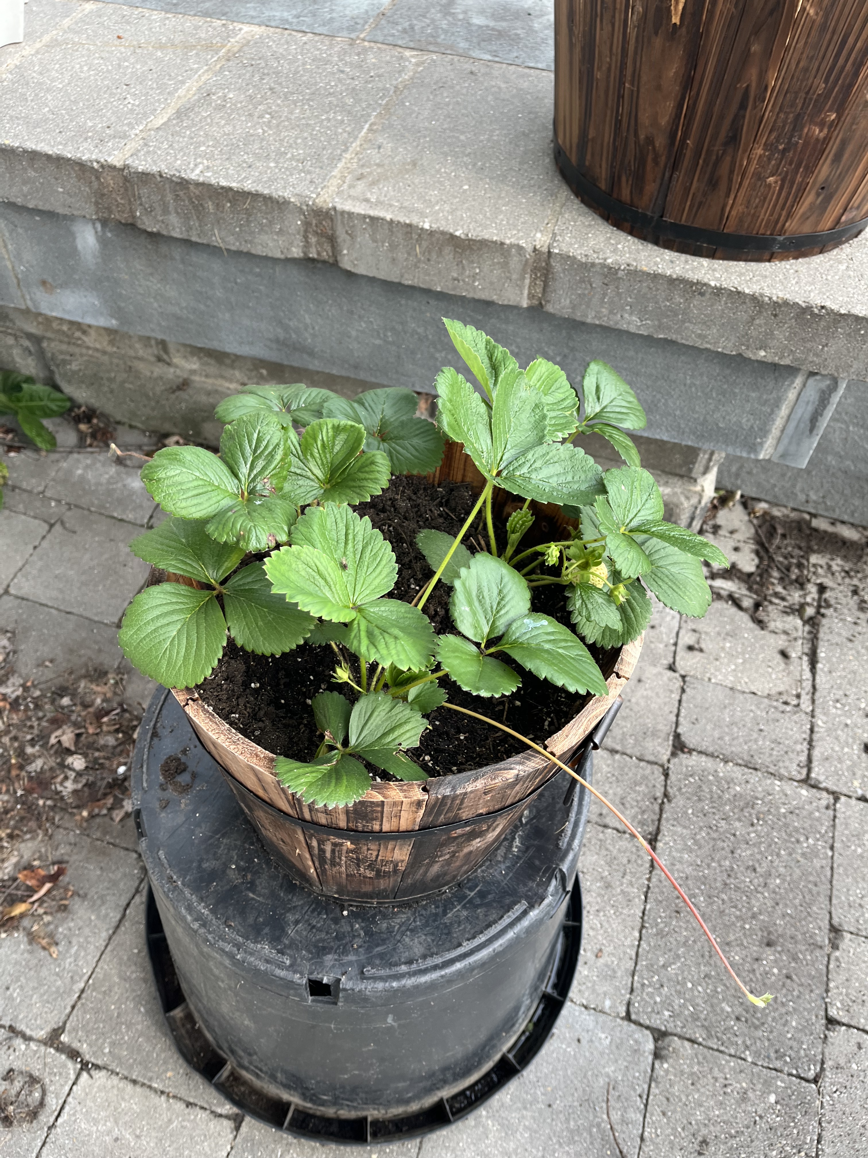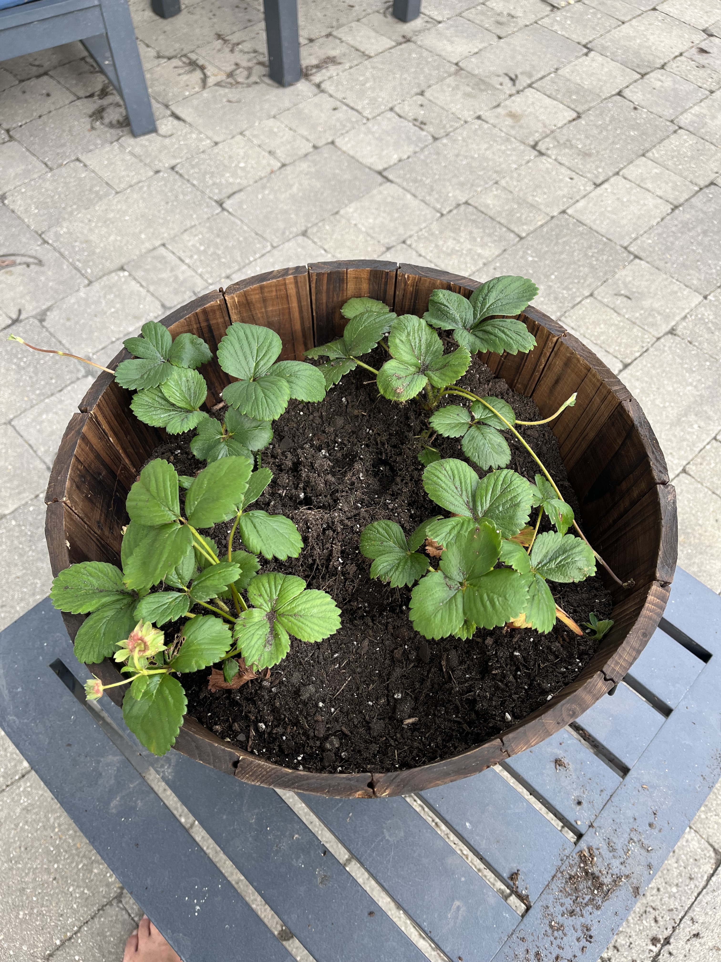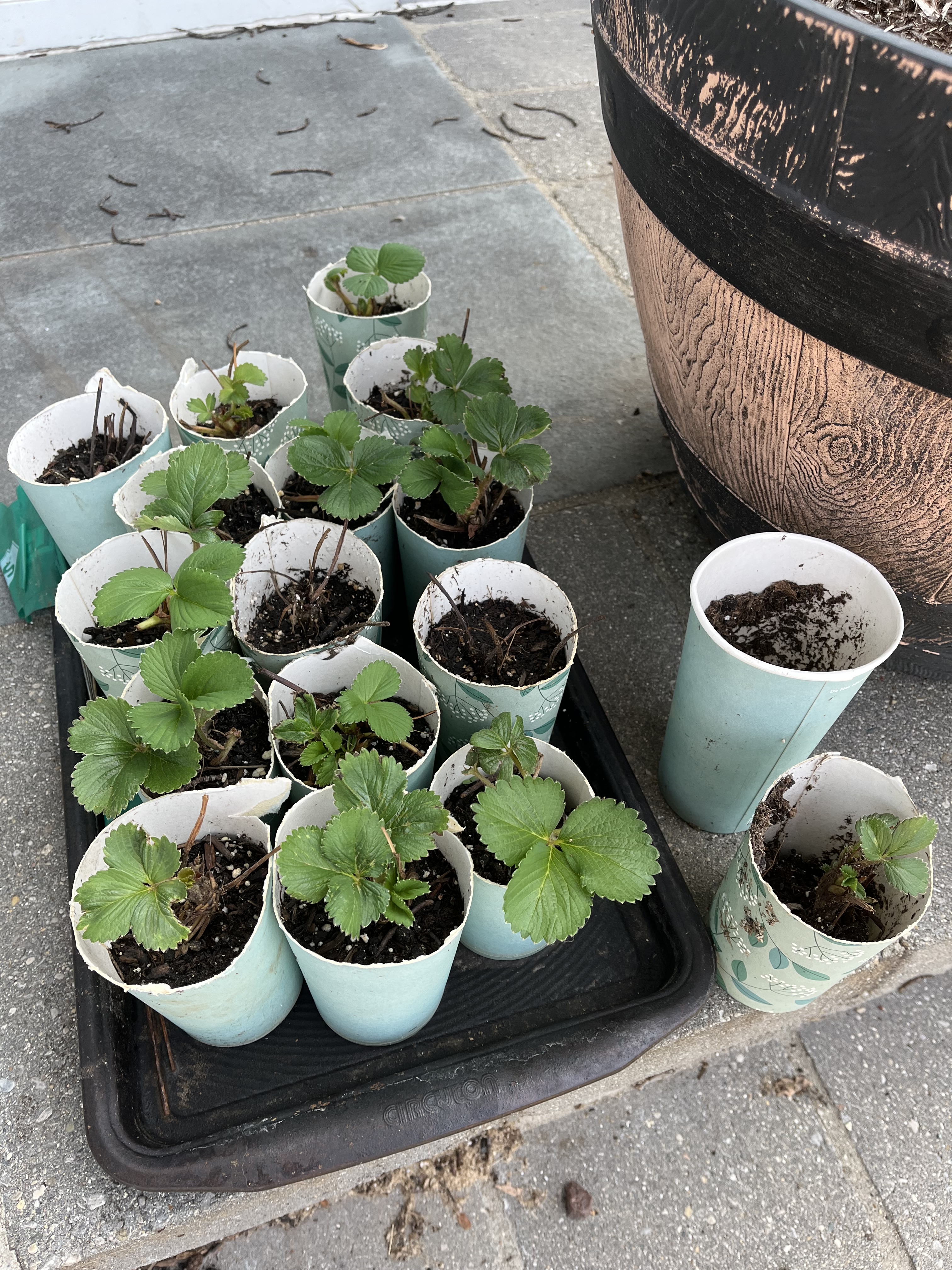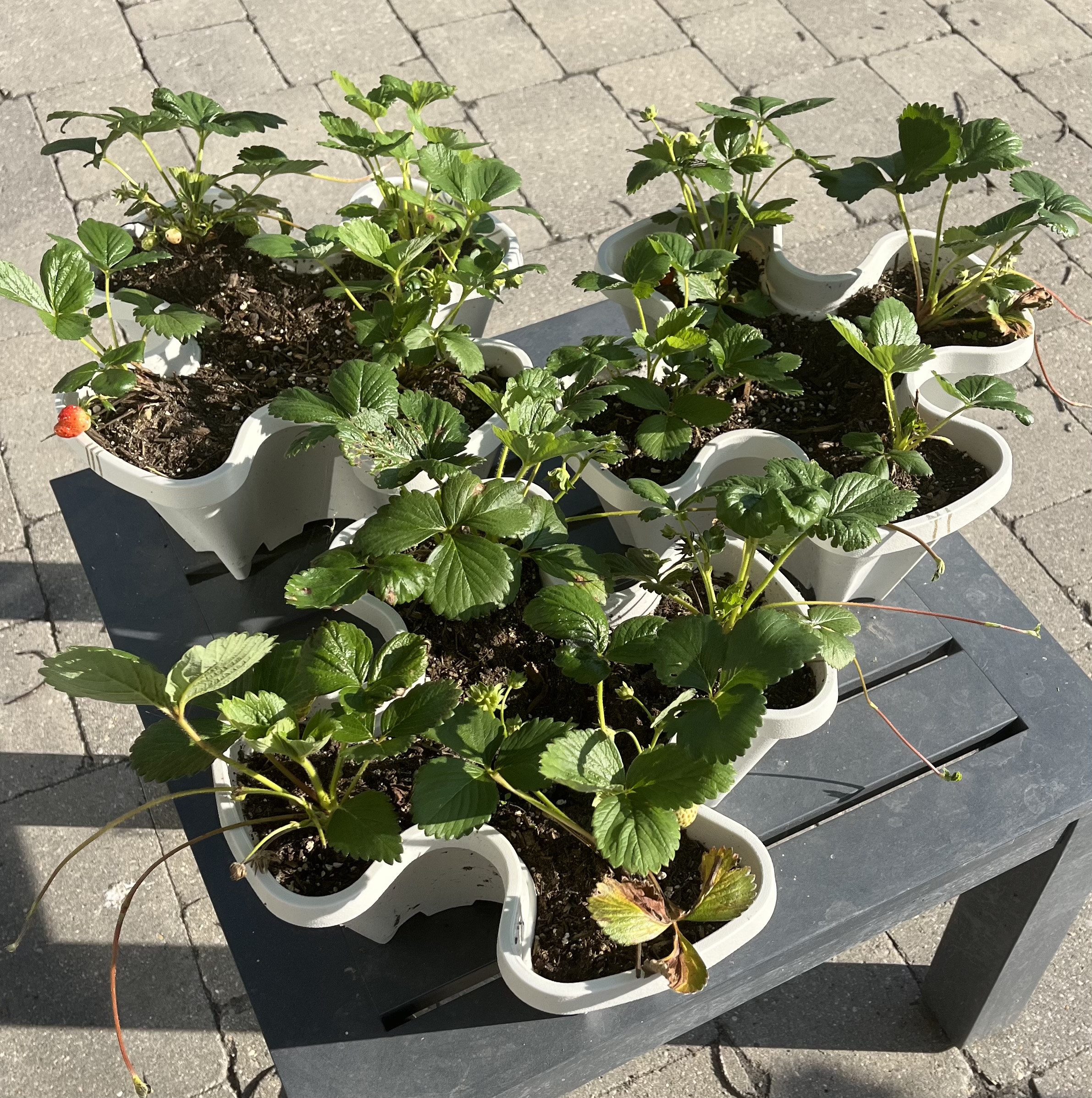 7.30.2023 We ordered small strawberry roots and put them in cups. Once they sprouted, we moved them to the plastic tower pieces. They grew so fast they stunted all their strawberry growth because the soil was too shallow. So… we moved them all to bigger buckets. Now they are growing bigger.