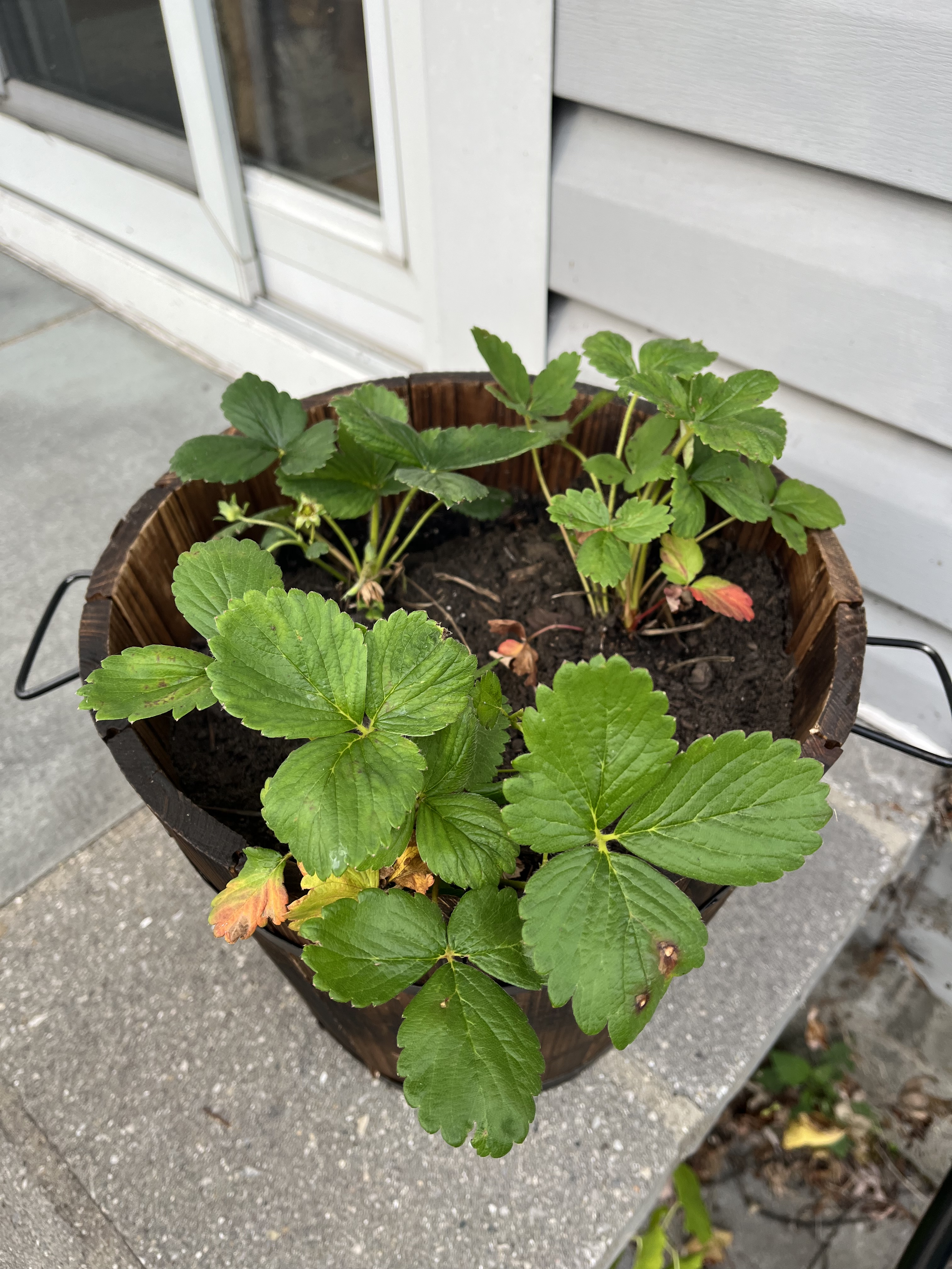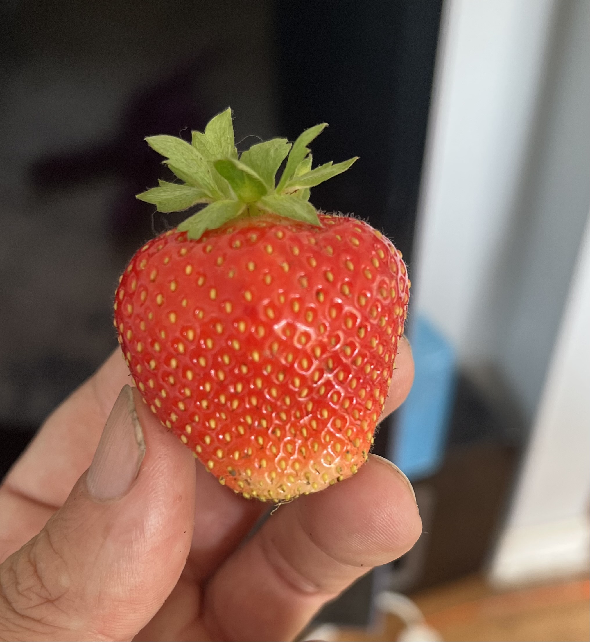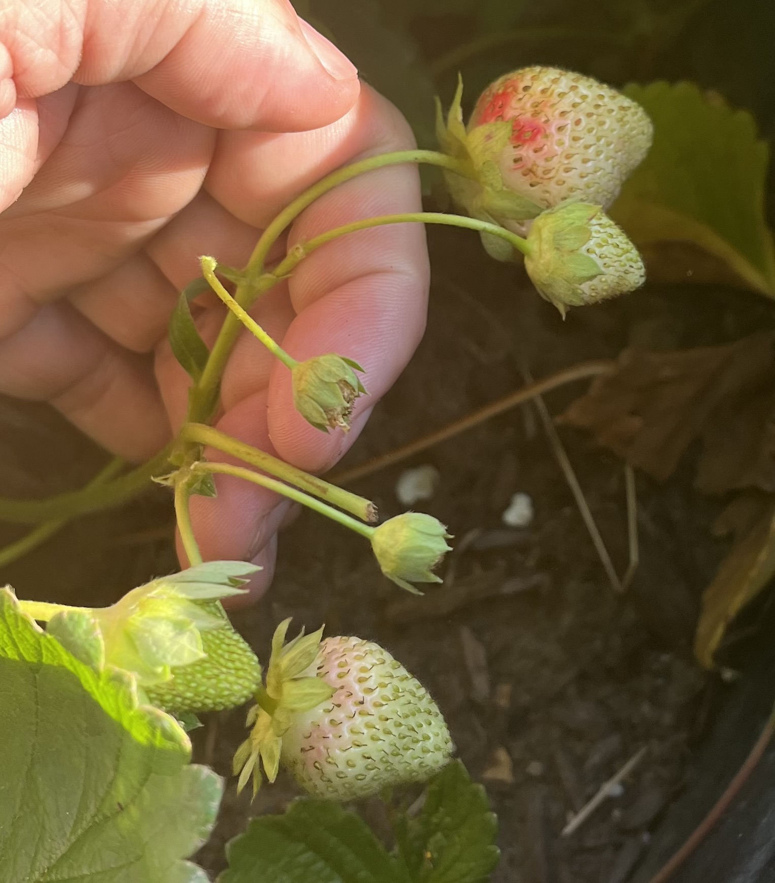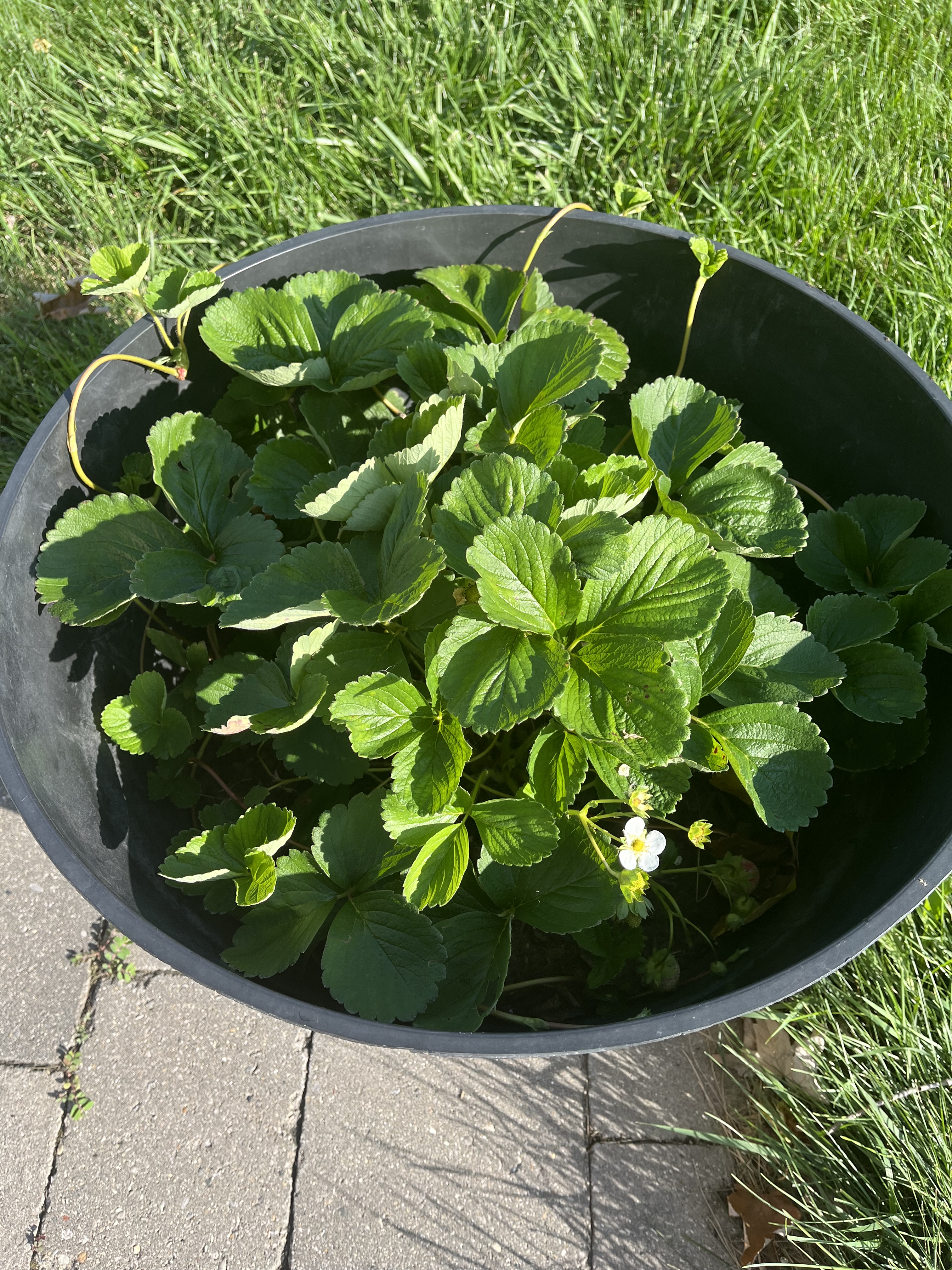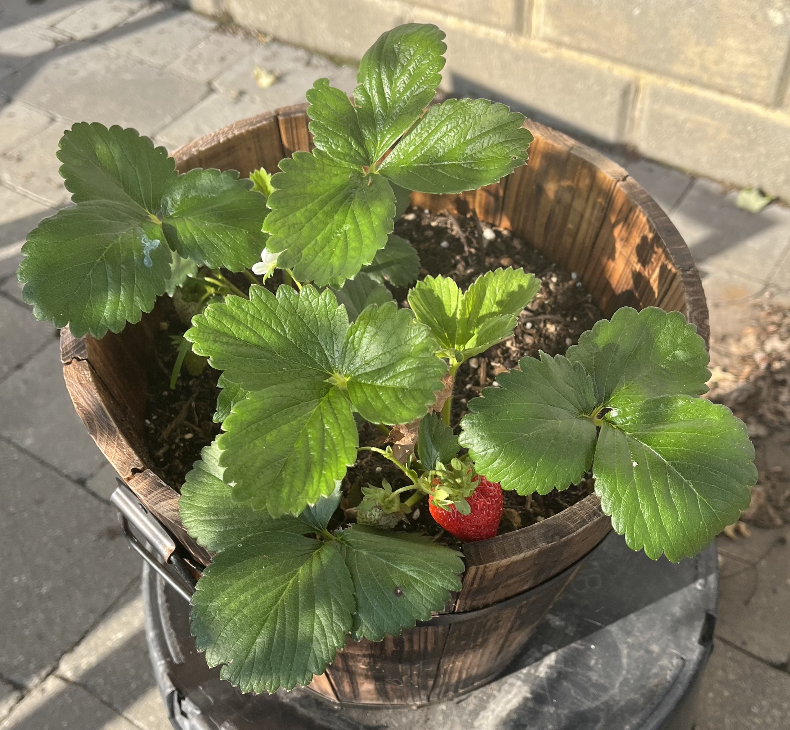 6.7.2023 We’ll never know what the first strawberry would’ve tasted like, as it was devoured in the night by a thief. Several robin witnesses in the area reported seeing a rabbit flee the scene into the neighbor’s bushes. Fortunately, these genetically engineered strawberries are hardy, and more grew back immediately the following week. By more, we mean one.